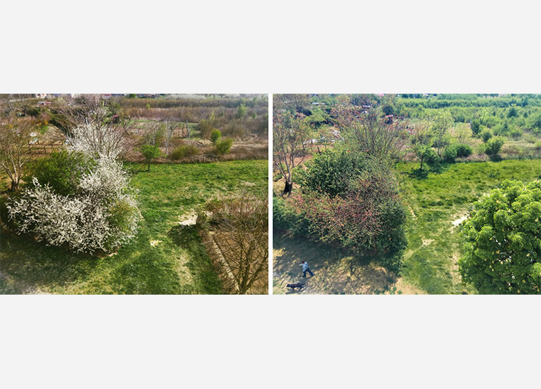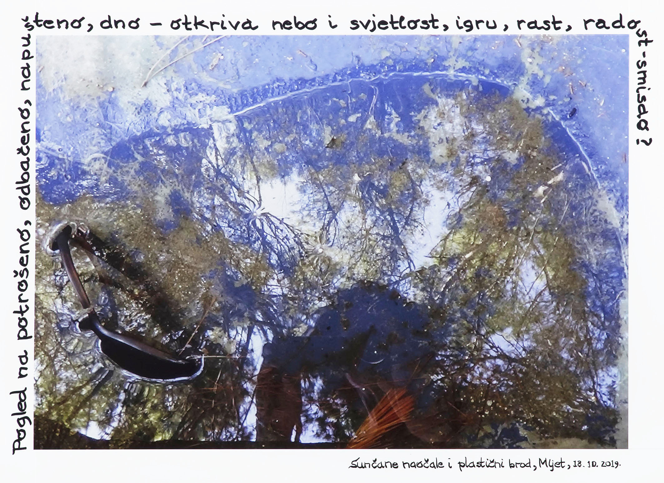 Za virtualnu izložbu fotografija „Pogled kroz moj prozor“ odabrala sam dvije fotografije iz ciklusa u nastajanju – (približno) isti kadar istoga motiva iz okruženja moga doma, snimljen u razmaku od tri tjedna. U vremenskome slijedu (ovdje s „preskokom“) pratim međusobnu igru prirode i čovjeka oblicima – intenziviranima bojama, teksturama, svjetlošću i sjenama – sada djelomično određenu koronom.