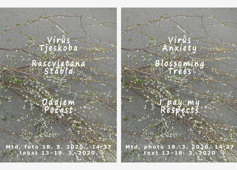 Nastavljam s pregledom crtica o mome osobnom ali i mnogo širem ljudskom proživljavanju teškoća koje je nametnulo „vrijeme koronavirusa“. (…) Usputni tihi homage pogubljenim urbanim stablima – posječenima prikriveno „koronom“.