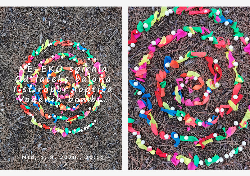 Kompozicija spirale od ostataka raznobojnih balona za „vodene bombe“ – komadića lateksa i kuglica stiropora, koje se čak ni u popratnim uputama ili opisu takvih proizvoda gotovo nikad ne spominju, a opasne su za zdravlje i okoliš…